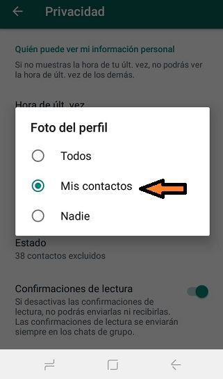 - Veras un recuadro flotante con tres opciones, Todos, “Mis contactos” y Nadie, en este caso escoge la segunda para que solo las personas que tienes registradas en tu agenda puedan ver la foto de perfil.