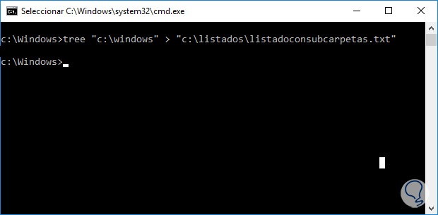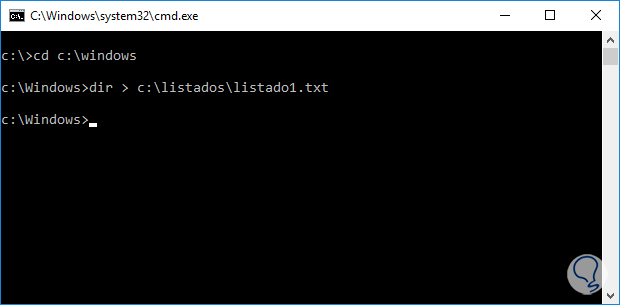 1) Te vas a la carpeta que quieres sacar listado. Para ello usa el comando "cd" para cambiarte de directorio en mi ejemplo he puesto "cd c:\windows".