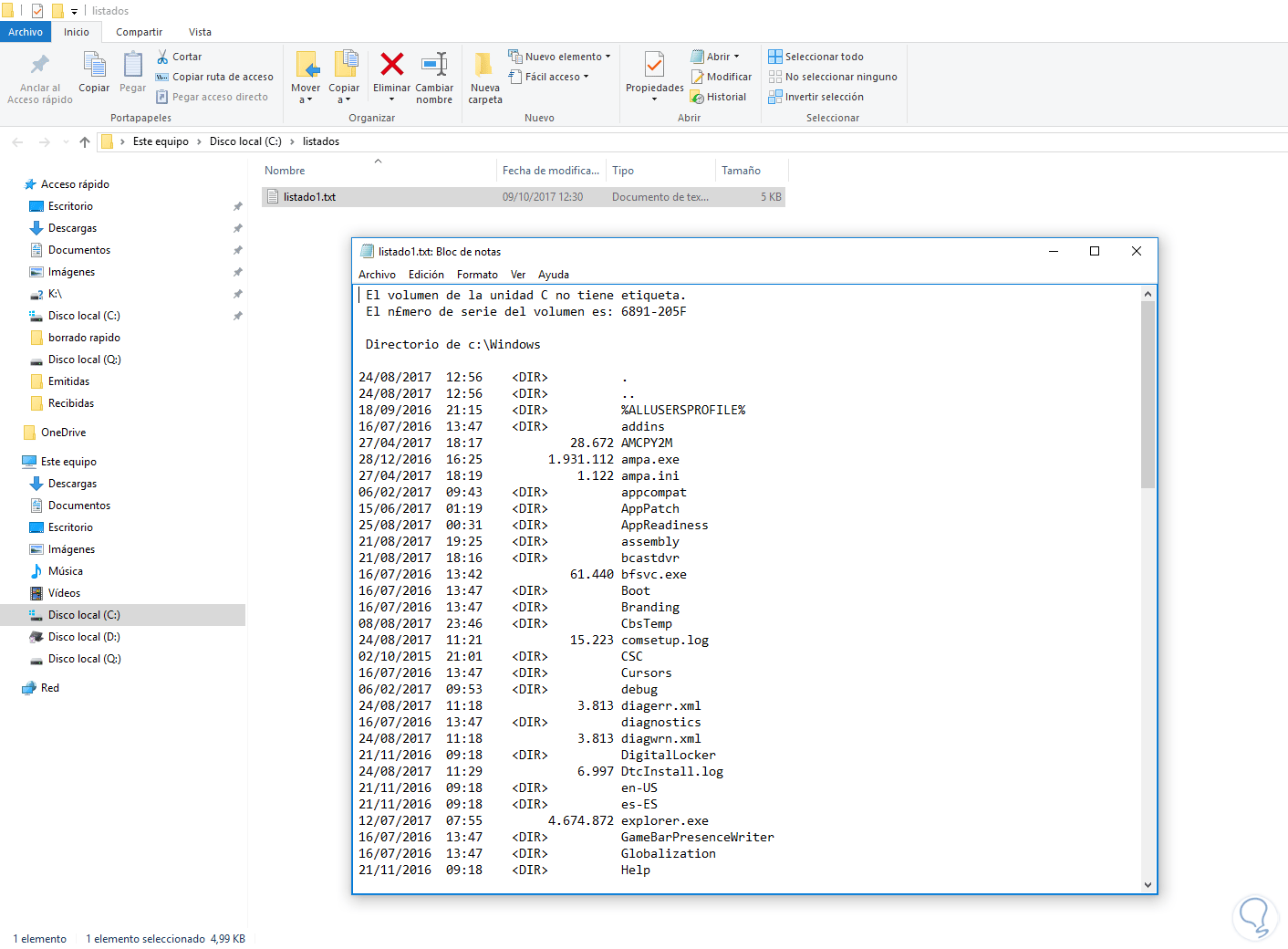 2) Ahora dentro escribes el siguiente comando: dir > listado.txt
