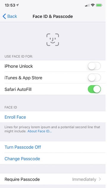 Como ves te salen ahi las opciones de donde usar el Face ID (desactiva todas) y pon abajo el requerimiento de passcode siempre.