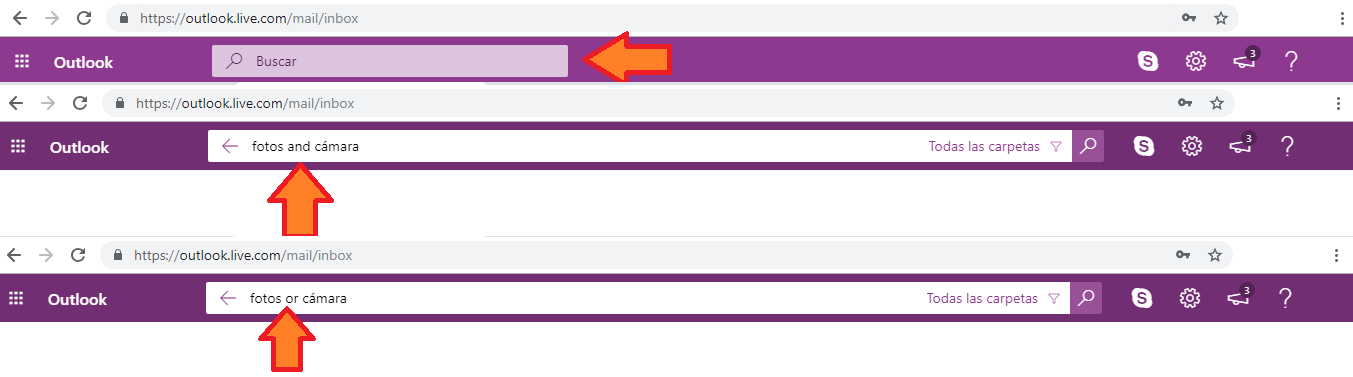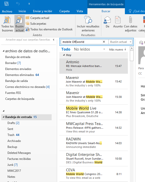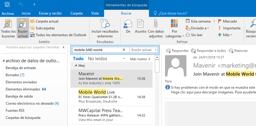 Por ejemplo vas a la bandeja de entrada en la zona arriba del buscador rápido y ponemos: palabras como mobile AND world. Veremos que buscará y mostrará los correos que tengan si o si las dos palabras que hemos puesto en la búsqueda.