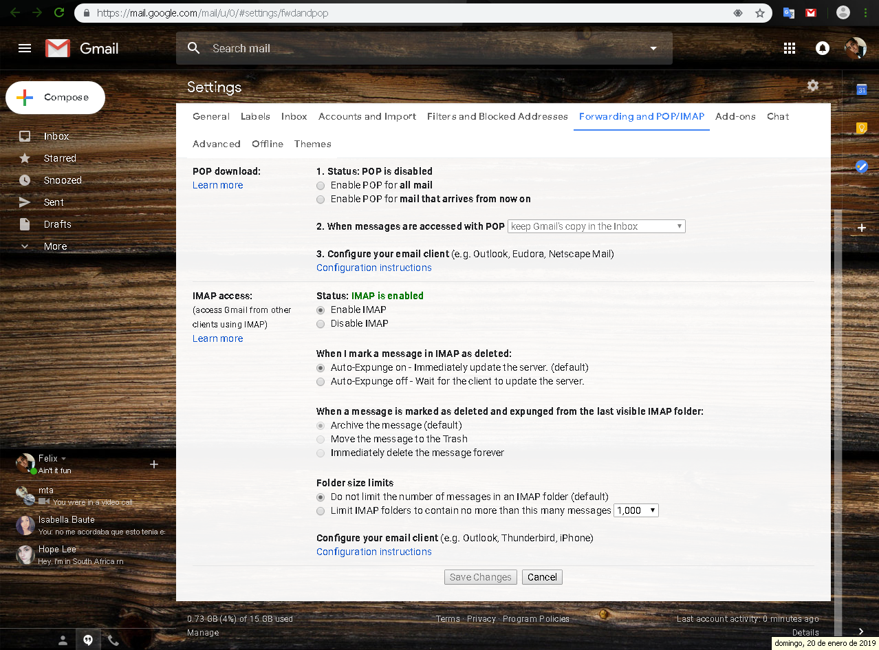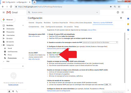 Una vez habilitado IMAP o POP3,debes hacer lo siguiente: