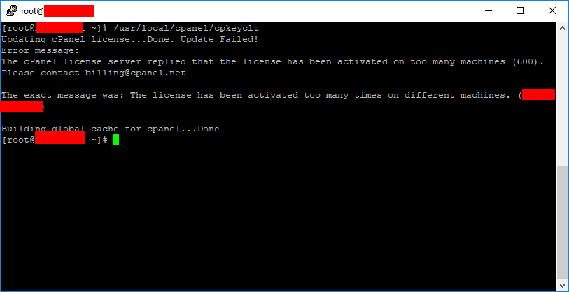 - Entra en modo comandos a tu servidor dedicado, es decir, que entres via SSH como root y una vez hayas migrado la licencia al nuevo servidor y veas que el paso 1 está Ok y activado, debes ejecutar este comando que es para que sea actualizada la licencia CPanel en ese servidor: /usr/local/cpanel/cpkeycit