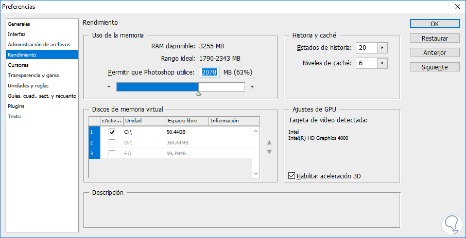 En la barra de búsqueda de windows escribe: "ejecutar" y das clic en la aplicación que te aparece, escribe "regedit" en ella y das aceptar, escribe "HKEY_CURRENT_USER\Software\Adobe\Photoshop\120.0" (o el numero que tu tengas instalado, en mi caso es 90.0) en la barra blanca de arriba y das Enter, en la carpeta que te sale das clic derecho>nuevo>valor de DWORD, se creará un archivo, cambiale el nombre a "OverridePhysicalMemoryMB", luego le das clic derecho sobre el archivo, modificar, seleccionas la opción que dice decimal y le asignas el valor de tu memoria RAM en decimal (ejemplo: 24gb RAM = 24000gb RAM), mi memoria ram es de 4gb así que escribí: 4000 en el valor, le das Ok y cierras todo, ahora si abres photoshop y estará solucionado.