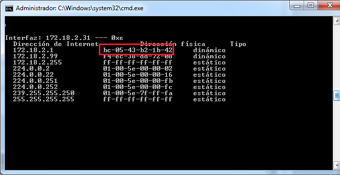 En mi caso mi router es el 172.18.2.1 como verás la Dirección MAC aparece a la derecha de la dirección IP.