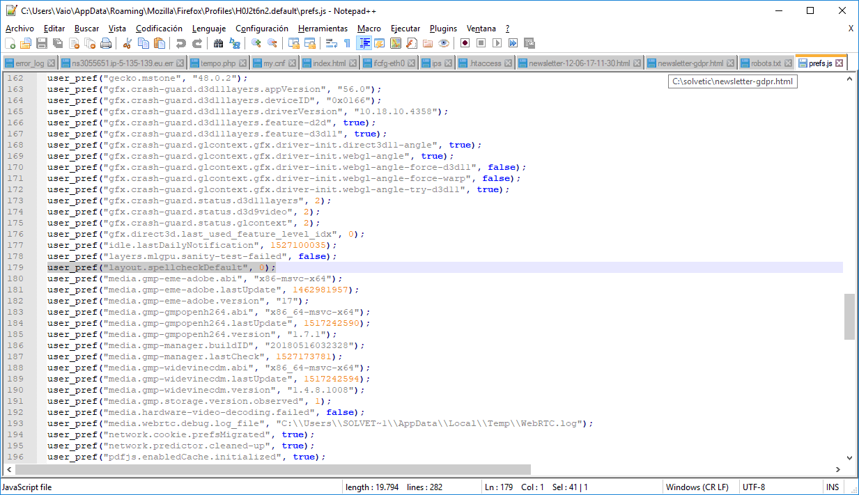 - Ahora abres el archivo prefs.js con un editor de texto como el Bloc de notas.