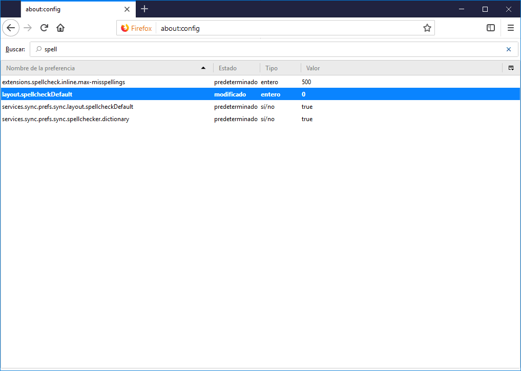 - Ahora ponte encima de la entrada "layout.spellcheckDefault" y pulsa dos veces encima.
