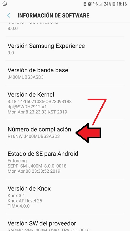Paso 5: Luego selecciona la opción“Numero de compilación” aquí tendrás que pulsar de manera consecutiva por 7 veces, así el sistema te indicara que eres desarrollador