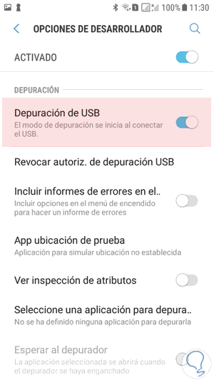 Paso 8: Escoge la alternativa “Depuración USB” activa esta opción desplazando el hacia la derecha el botón y se tornara de color azul.