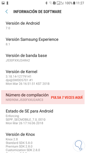 - Se abrirá una nueva ventana con distintas opciones, en donde debes ubicar la opción “Numero de compilación” y pulsar sobre esta siete veces.