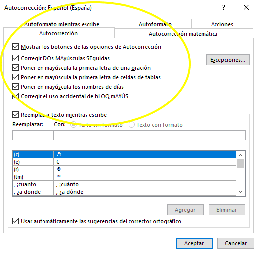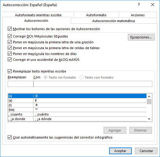 Aquí vas a poder ver que hay una pestaña en la que pone “Opciones de autocorrección” Ahí tienes más opciones.