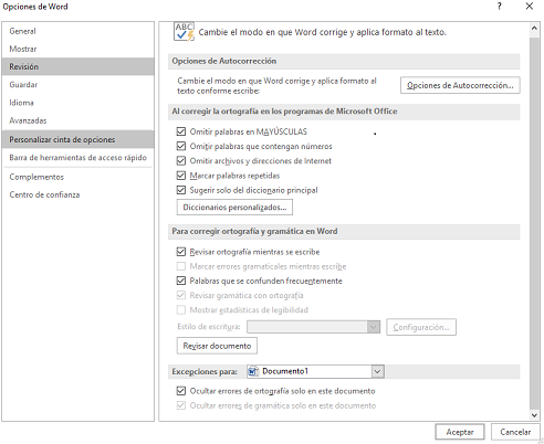 Luego podemos entrar en la opción "Opciones de ortografía" para configurar detalles, como son: