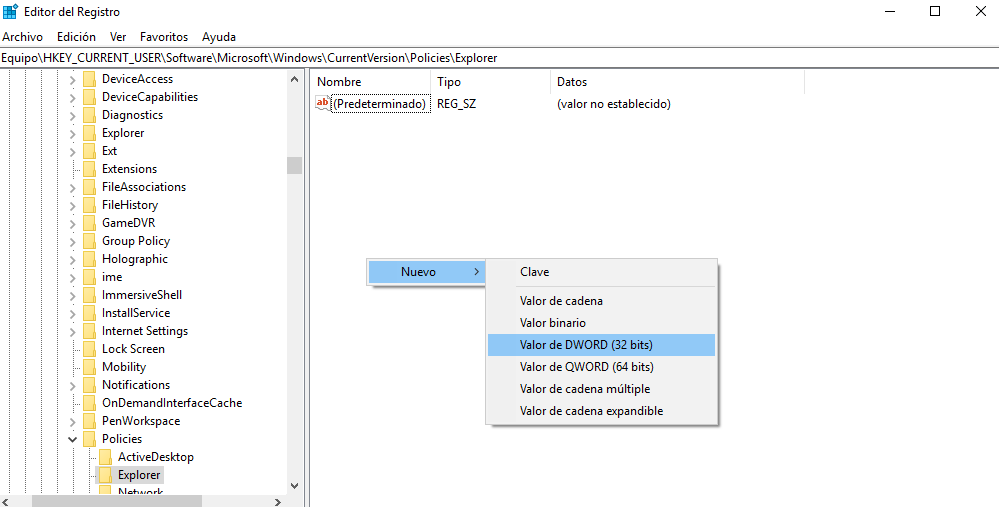- Una vez que te aparezca, deberás verificar que exista el valor de nombre “DWORD”.