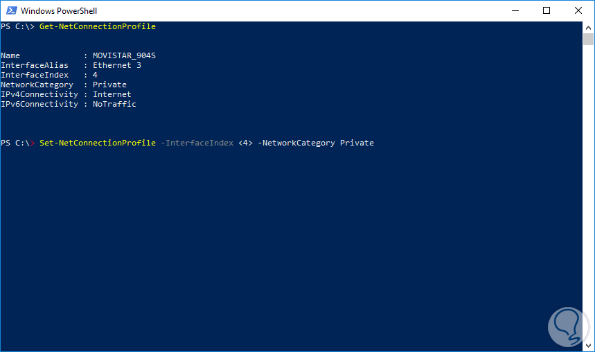 En caso de quieras cambiar la configuración de una red privada a una pública, es el mismo procedimiento lo único que debes cambiar es que en el último comando en vez de colocar al final “Private” debes colocar “Public” en inglés. Tener en cuenta que en mi ejemplo he puesto 4 porque es mi caso, pero puede cambiar bastante. Tenerlo en cuenta y mirar la imagen que da el ejemplo de los dos comandos.