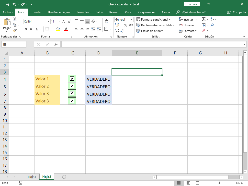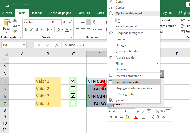 5. Ya tendríamos la primera parte conseguida. Cuando marquemos o desmarquemos el check aparecerá nuestro texto. Ahora vamos a ocultar los resultados de VERDADERO y FALSO. Seleccionamos todas las celdas de Verdadero y Falso y con clic derecho vamos a Formato de celdas…
