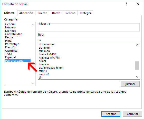 6. En esta pantalla elegimos Personalizada y escribimos tres “;;;” y damos en Aceptar.