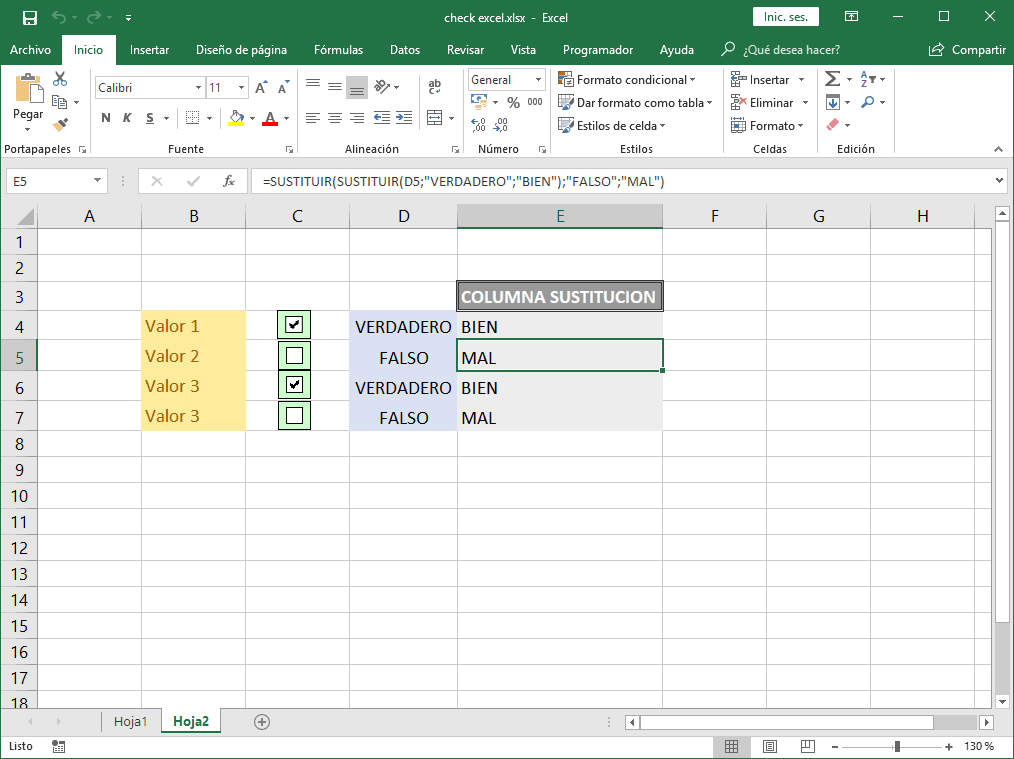 =SUSTITUIR(SUSTITUIR(CELDA;"VERDADERO";"BIEN");"FALSO";"MAL")