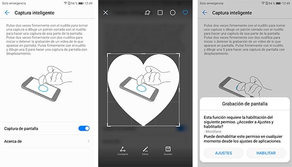 Puedes grabar lo que sucede en tu pantalla, tocando 2 veces con tus nudillos, el teléfono captará lo que vas realizando en el teléfono, el audio del teléfono y los sonidos externos. Para detener la grabación debes nuevamente hacer dos toques con los nudillos.