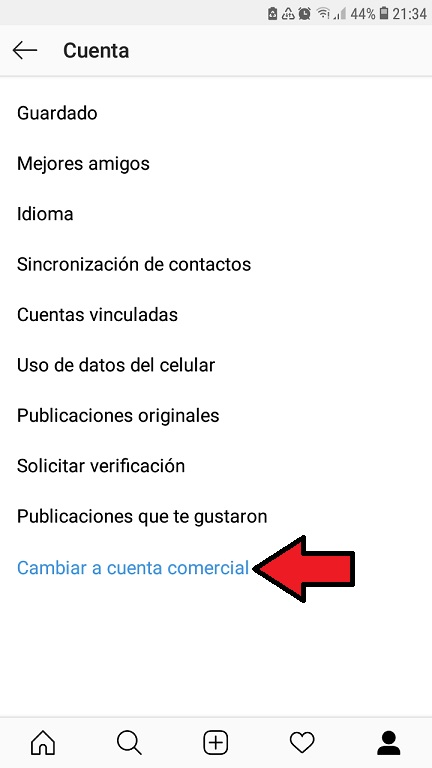 • Cuando lo hayas hecho, veras que en la parte de abajo habrá una descripción en color azul, la cual dice “Cambiar a cuenta comercial”, debes presionar esta.