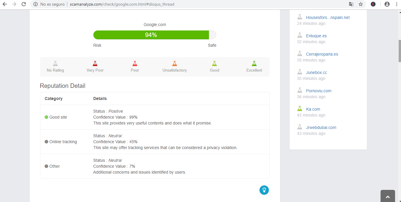- Una vez terminado el análisis, es aquí donde te informa acerca de la legitimidad de la página diciéndote si es seguro o no utilizarla, todo esto con el fin de acabar con el scam.