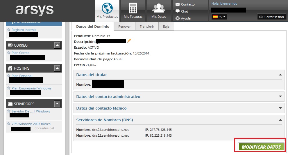 - Entra en tu hosting donde tienes el dominio, en tu caso en Arsys.com con tus datos de entrada.