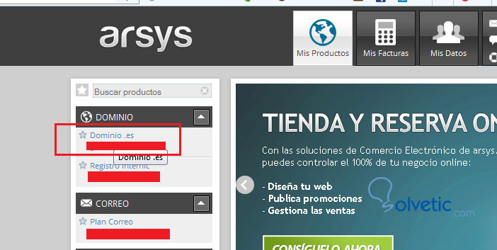 - Una vez dentro, entra en Mis productos, y luego a la izquierda verás el dominio.es o .com o el que sea que hayas contratado.