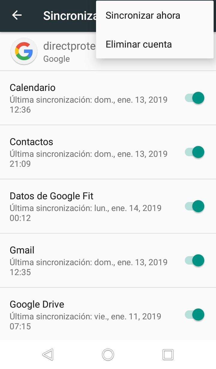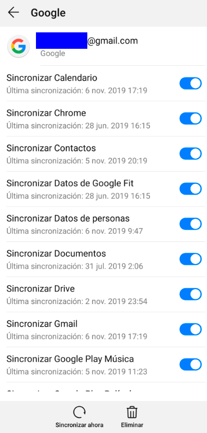 En este aparatado puedes configurar las sincronizaciones de la cuenta de Google, en sus diferentes aplicaciones como: Calendario, Chrome, Contactos, Drive, Gmail.Estas opciones sirven para poner por defecto sincronizaciones automáticas o no. Yo tengo marcadas como puedes ver prácticamente todas las opciones, con el check en azul. Si deshabilitas alguna opción la sincronización tendrás que hacerla de forma manual. Yo por ejemplo el correo la tengo siempre en automático para ver los correos justo en el momento que me llegan.