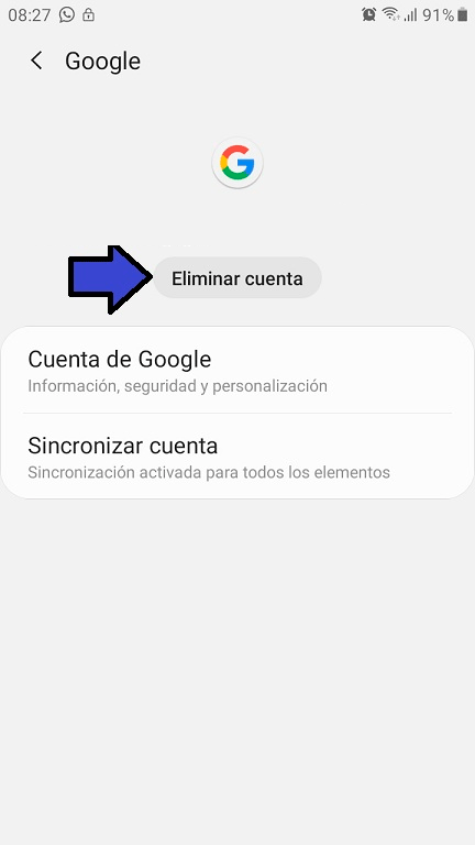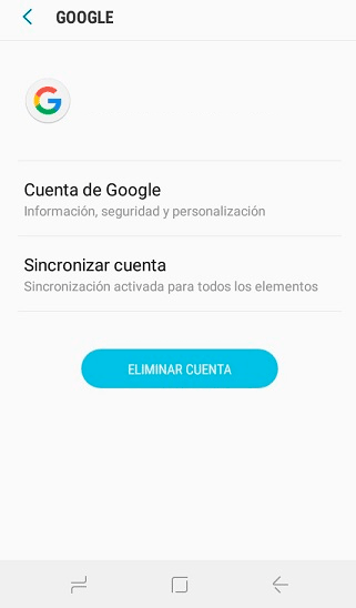 • Podras observar el apartado Google que viene a ser la cuenta que se encuentra vinculada a tu móvil, asi como el correo que se encuentra relacionado con esta cuenta, ahora pulsa sobre “Google” y se mostrara la opción de “Eliminar o borrar la cuenta”.