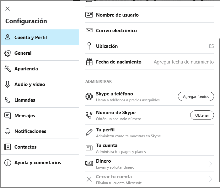 En las opciones de Skype de tu cuenta solo aparece esta opción abajo del todo. Pone: "Cerrar tu cuenta" "Elimina tu cuenta Microsoft"