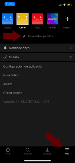 - Entra en la aplicación de Netflix e ingresa en tu cuenta. Pulsa abajo a la derecha en el menú pulsando en "Más".