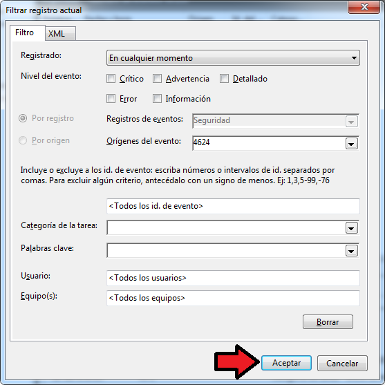 • Luego, cuando se te muestre el menú emergente, ve a la sección de “Orígenes del evento” y coloca en dicha casilla la descripción “4624” la cual es utilizada al momento de iniciar sesión.
