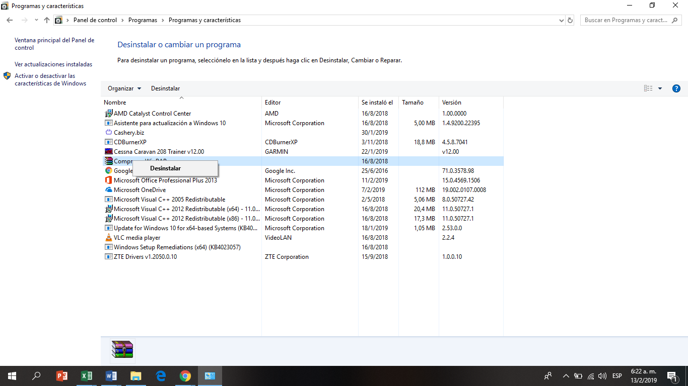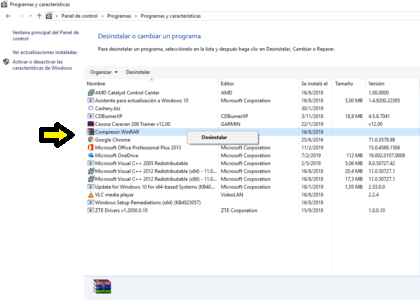 - Sin hacer otra cosa, desinstala WinRAR desde el panel de controlcomo en el paso anterior, y está pendiente de nunca apretar el botón derecho del mouse durante el procedimiento.