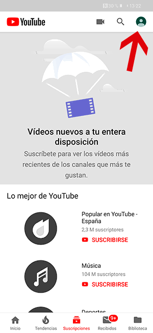 1. Abre tu App de YouTube de Android y pulsa en la parte superior derecha donde aparece tu perfil