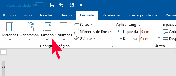 1. Abre tu documento de Word y ve al apartado de Formato en la parte de arriba. Tienes que seleccionar el icono de tamaño.