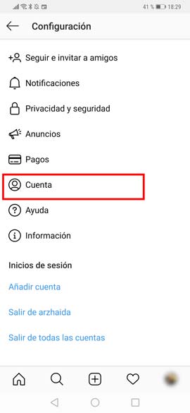 • Una vez dentro vas a ver muchas opciones de configuración, busca y accede a la que dice "Cuenta".