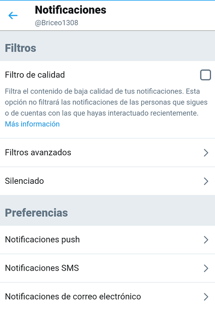 Para esto la ruta que tienes que seguir es esta: Notificaciones, Configuración, Filtro de calidad y aquí tienes que activar o desactivar la opción y listo. Si esto no funciona te recomiendo que actualices la App. Para lo cual tienes que entrar en Play Store y buscar Twitter. Si ya la tienes descargada y hay actualizaciones disponibles verás en un botón verde la palabra “Actualizar”, sobre la cual tienes que pulsar y una vez hecho reiniciar el móvil.