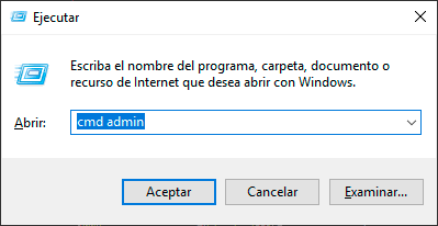 Paso segundo: Escribe el comando “cmd admin” en el panel de “Ejecutar”. Estamos ejecutando la consola con permisos de administrador sino no podrían aplicarse los cambios.