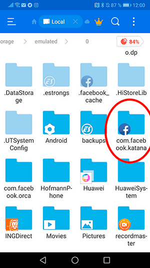 Aquí, entre todos los archivos disponibles encontrarás la carpeta .com.facebook.katana.