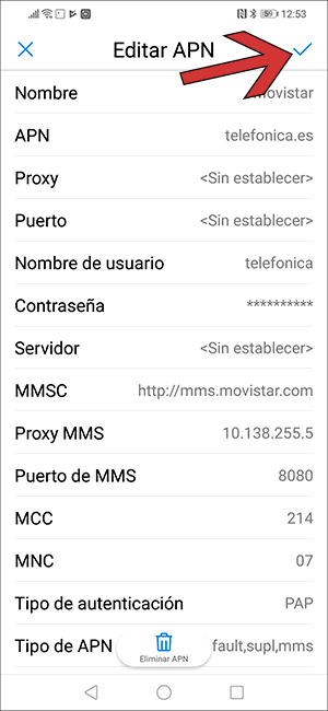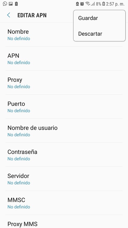 Ahora debes llenar los siguientes puntos para configurar tu APN Movistar: