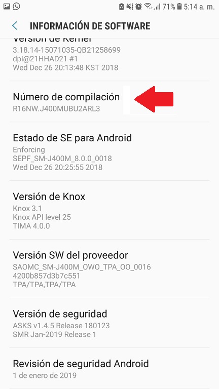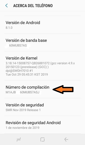 Paso 3: En el apartado “Numero de compilación” deberás pulsar 8 veces consecutivas para activar las “Opciones de desarrollador”