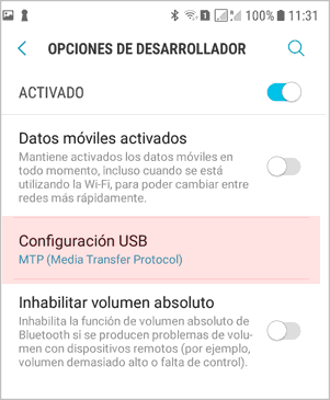- Después de que hayas entrado allí, presiona “Configuración USB” y posteriormente, tienes que seleccionar “Media Transfer Protocol (MPT)”.