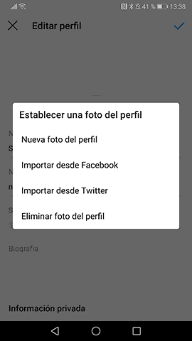 Por último se desplegará la siguiente ventana. Aquí podrás elegir una foto de perfil de la galería o de otras redes sociales como Facebook o Twitter. También puedes directamente eliminar la foto de perfil.