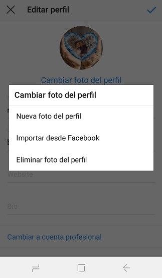 - “Importar desde Facebook” al escoger esta opción se cambiara tu foto de instagram por la que tienes en tu perfil de Facebook.
