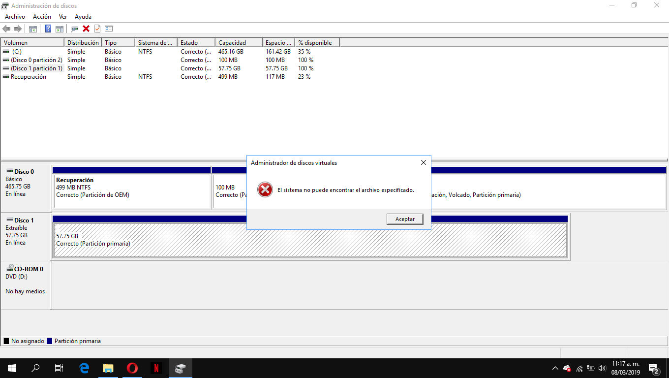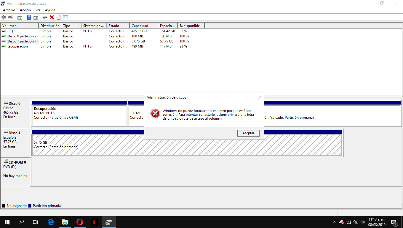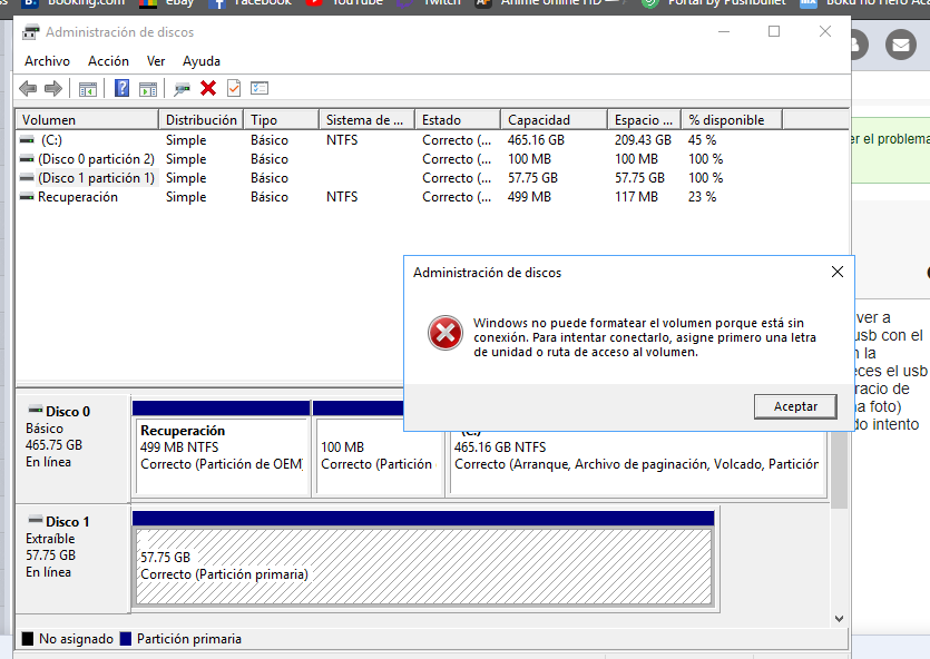 hola, hoy estaba formateando mi pc(mediante usb) todo normalmente cuando luego quize formatear mi usb para volver a usarlo normalmente( esto lo hice mediante una aplicacion llamada bootice debido a que anteriormente formatee mi usb con el metodo tradicional y me bajo de 57gb a 32gb) pero cuando finalizo el formateo me percate de que ya no aparecia en la seccion " este equipo" el usb , ingrese a la administracion de discos ( despues de haber sacado y puesto muchas veces el usb ademas de cambiarlo de puerto y revisar si mi controlodador del puerto usb estaba obsoleto o algo) y en la administracio de disco aparece el usb pero sin letra asignada y al parecer sin particion y dice principal o algo por el estilo ( adjunto una foto) cuando intento crear o eliminar una particion me lanza un mensaje de error diciendo " solicitud no compatible" cuando intento cambiarle la letra me dice "el sistema no puede encontrar el archivo especificado"y si lo intento formatear desde alli salta un mensaje de erro que tambien adjunto en una foto , alguien que pueda ayudarme porfavor