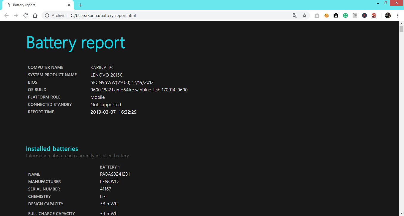 3. Verás que crear un archivo HTML con el informe energía de la batería con sus ciclos en una ruta tipica como es esta en este ejemplo: