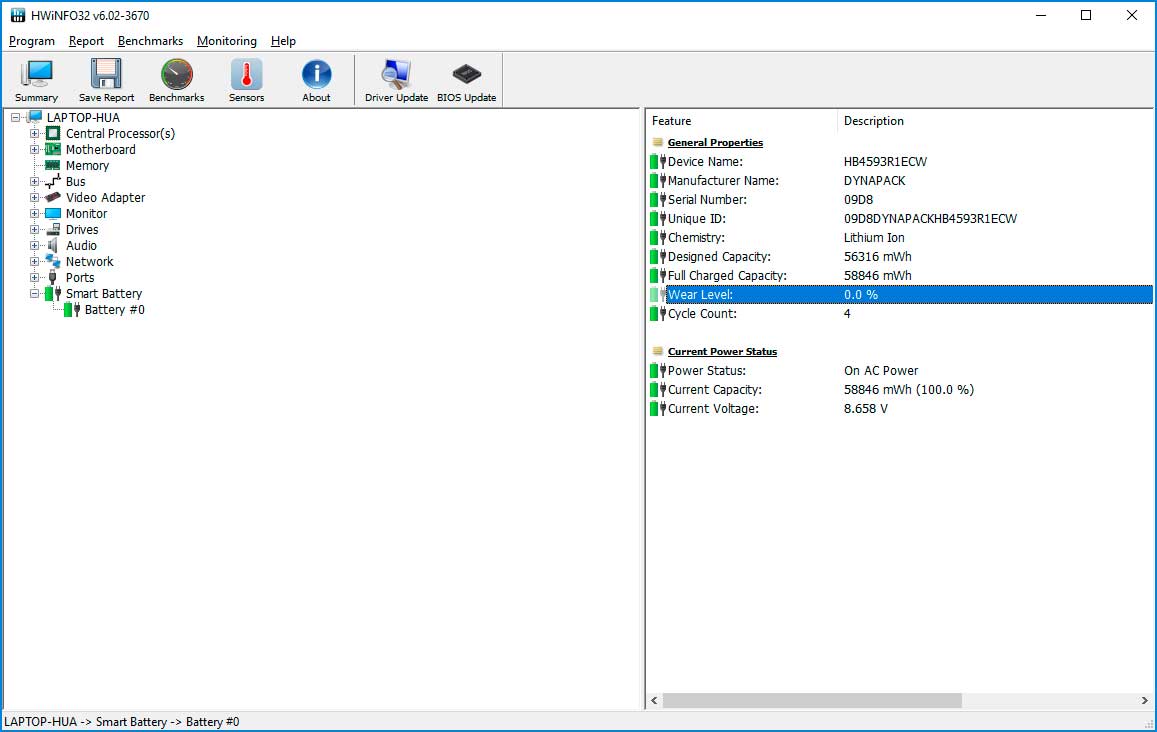 4. Lo que tienes que hacer ahora es entrar en el programa y abrir "Smart Battery" y luego en "Wear Level" verás el porcentaje de vida de la batería de tu portatil, en mi caso sale 0% es decir, que la batería esta nueva completamente y es que me he comprado el portatil hace 2 semanas.