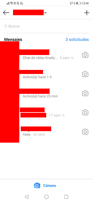 Al entrar el chat directo de Instagram, lo primero que vas a ver son las casillas de los usuarios con los que has hablado últimamente. Ahora bien, justamente debajo del nombre de usuario de la cuenta de la persona, vas a ver un texto que dice “Activo” más un punto verde, si está conectado.