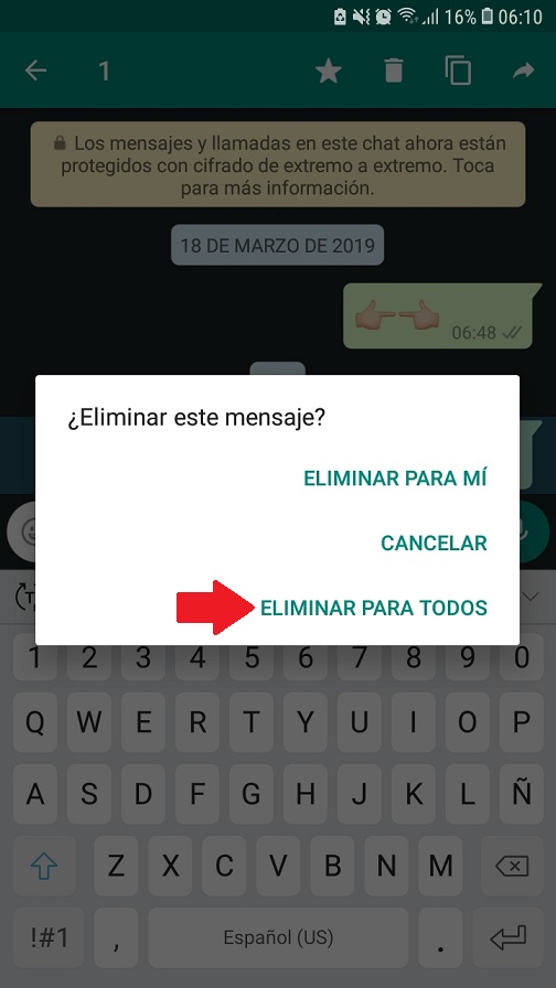 • Posiciónate sobre el mensaje que deseas eliminar y mantenlo presionado por unos segundos, se desplegara un cuadro que dice ¿Eliminar este mensaje? Y tienes tres opciones allí escoges “Eliminar para todos” una vez hecho desaparecerá el mensaje pero quedaramarcado con esta leyenda: ESTE MENSAJE HA SIDO ELIMINADO.