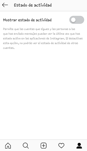 A continuación se muestra la alternativa “Mostrar estado de actividad” a su lado encontraras un botón que debe mostrarse de azul indicando que está activado, tendrás que moverlo hacia la izquierda para desactivarlo y así no se mostrara más el punto azul al lado de los perfiles en la sección de búsqueda.