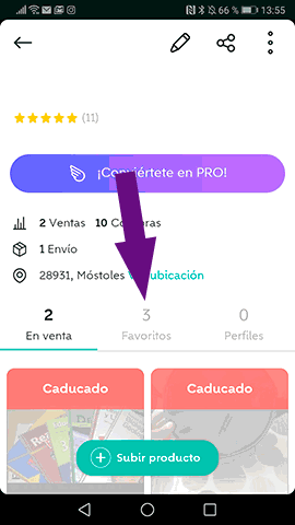 Aquí, en la parte inferior puedes ver los artículos en venta, los favoritos y los perfiles. Pulsa en Favoritos y allí estarán archivados todos los artículos que te han gustado por X motivo y no tendrás que buscarlos en el Scroll.